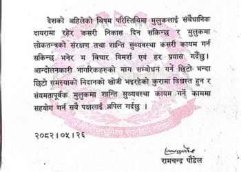 Read moreकाठमाडौँ, २६ भदौः राष्ट्रपति रामचन्द्र पौडेलले देशको वर्तमान विषम परिस्थितिमा मुलुकलाई संवैधानिक दायरामा रहेर कसरी निकास दिन सकिन्छ र मुलुकमा...