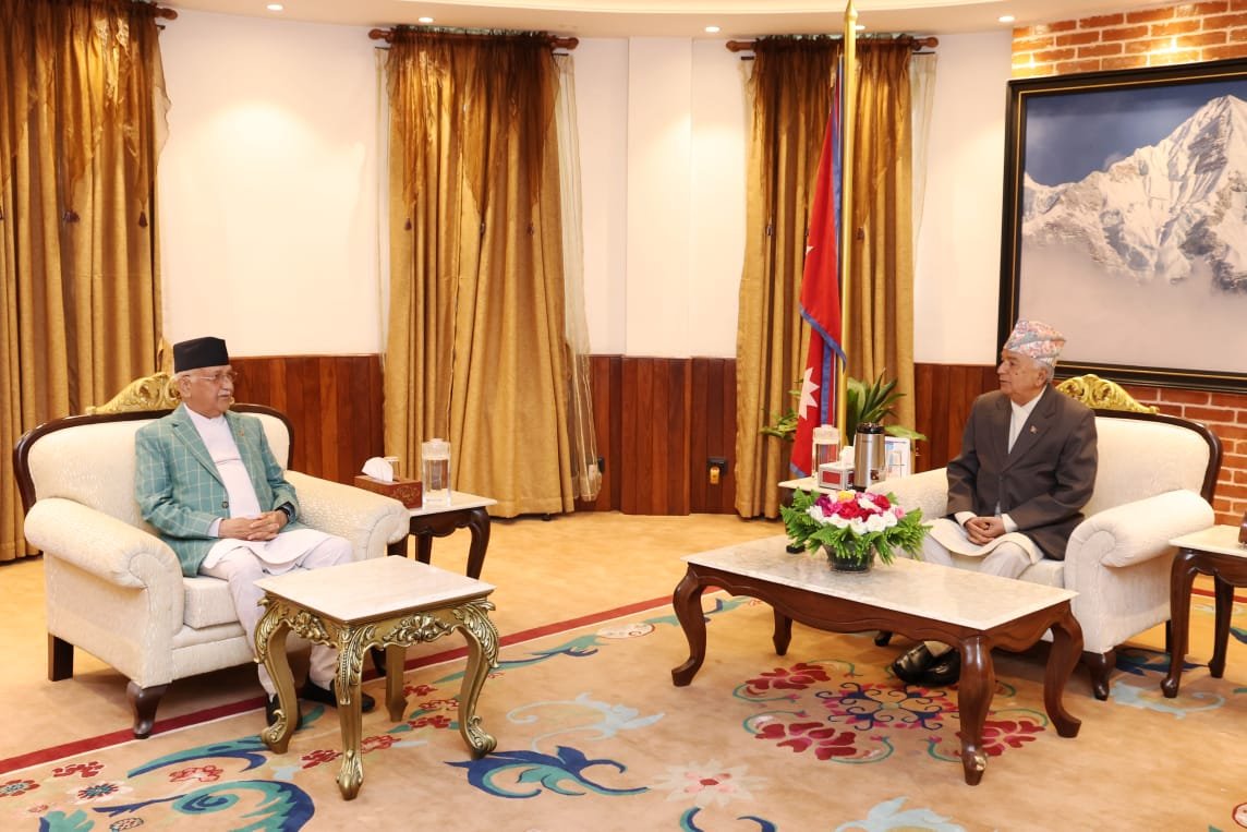 काठमाडौँ, २५ साउनः राष्ट्रपति रामचन्द्र पौडेल र प्रधानमन्त्री केपी शर्मा ओलीबीच भेटवार्ता भएको छ ।