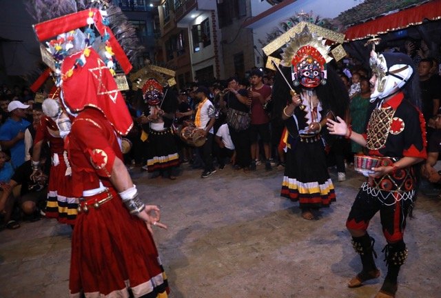 भक्तपुर, २९ साउनः मूर्त कला मात्रै होइन, धार्मिक पर्वले परिपूर्ण विभिन्न अमूर्त कला, संस्कृति, पर्व एवम् परम्पराको भण्डार ऐतिहासिक मध्यपुरथिमि नगरी यतिखेर धार्मिक एवम् ऐतिहासिक महत्व बोकेको परम्पराले नाचिरहेको छ । प्रत्येक वर्ष वैशाख २ गते सिन्दुर जात्रा, जिब्रो छेड्ने जात्राले मात्रै होइन, गाईजात्राको भोलिपल्ट द्वितीयादेखि पञ्चमीसम्म चार दिन तीन रात अनवरत रूपमा टोलटोलमा नाचिने विभिन्न देवीदेवताका नाचले मध्यपुरथिमि यतिखेर राति पनि ब्युझिरहेको छ ।