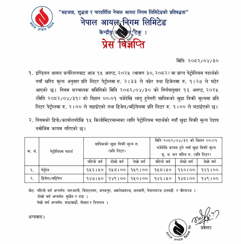 निगमले भारतबाट पेट्रोलमा प्रतिलिटर २.३३ रुपैयाँ बढेर आएको र डिजलमा १.२७ रुपैयाँ घटेर आएको जानकारी दिएको छ ।