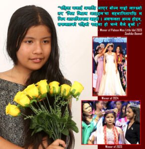 यदि यहाँहरुले मिस लिटल आइडोलमा सहभागि हुनुअघिको ‘म’ र अहिलेको ‘म’लाई हेर्नुभयो भने धेरै फरक पाउनुहुनेछ । पहिला मलाई यसरी अगाडि आएर बोल्न धेरै नै गाह्रो लाग्थ्यो । जब मैले कक्षा ६ मा पढ्दा पहिलो वर्ष मिस लिटल आइडलमा सहभागी जनाएँ, मैले धेरै कुराहरु सिकेँ । सबैभन्दा महत्वपूर्ण कुरा त मैले म भित्रको म लाई चिन्ने मौका पाएँ । म मा आत्मविश्वास बढ्यो र त्यसलाई मैले प्रयोग गर्दै गएँ । कक्षा ७ मा पढ्दै गर्दा पुनः दोस्रो पटक सहभागी जनाएर मिस लिटल आइडोलको ताज पहिरिन सफल भएँ ।