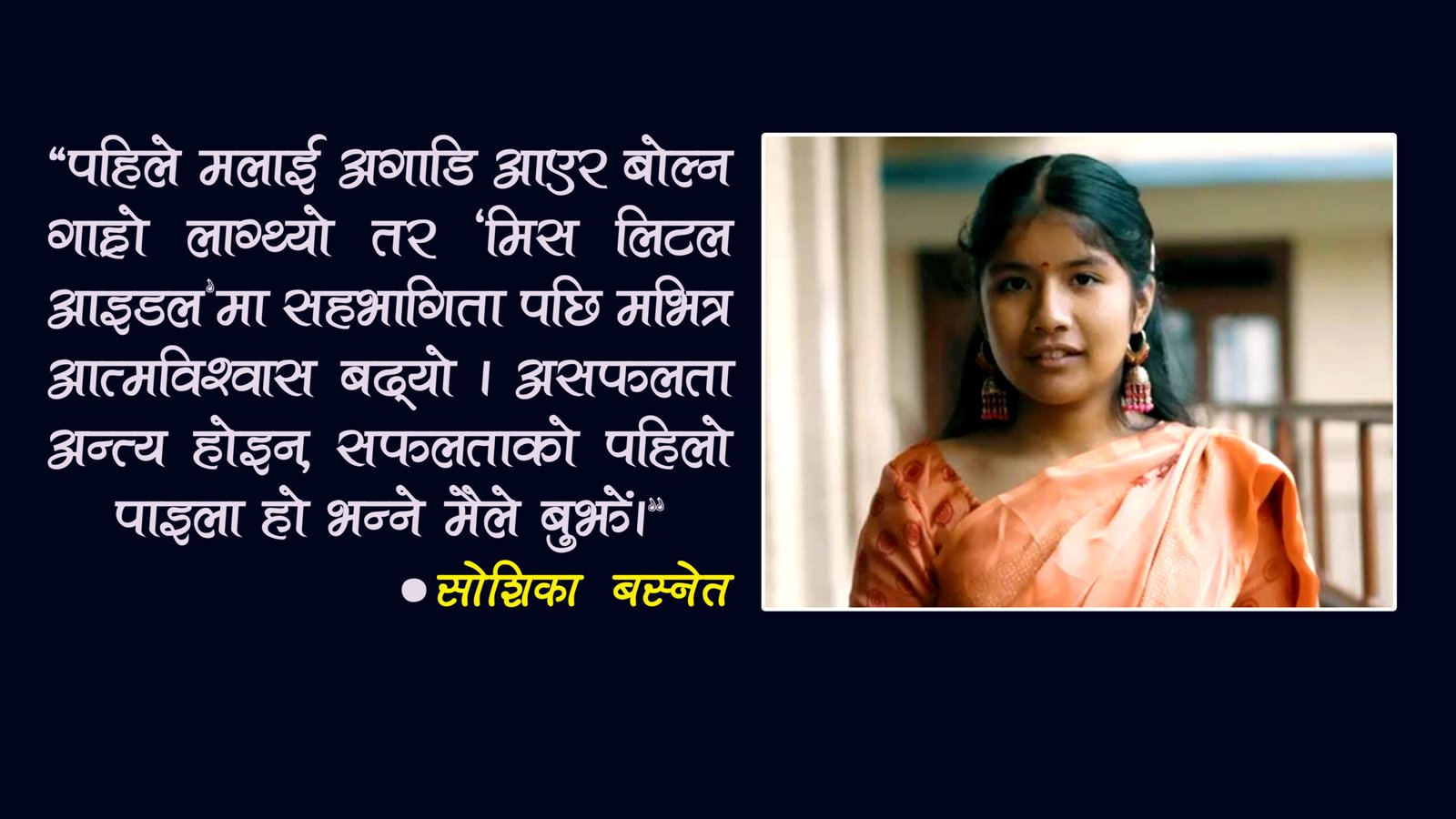 यदि यहाँहरुले मिस लिटल आइडोलमा सहभागि हुनुअघिको ‘म’ र अहिलेको ‘म’लाई हेर्नुभयो भने धेरै फरक पाउनुहुनेछ । पहिला मलाई यसरी अगाडि आएर बोल्न धेरै नै गाह्रो लाग्थ्यो । जब मैले कक्षा ६ मा पढ्दा पहिलो वर्ष मिस लिटल आइडलमा सहभागी जनाएँ, मैले धेरै कुराहरु सिकेँ । सबैभन्दा महत्वपूर्ण कुरा त मैले म भित्रको म लाई चिन्ने मौका पाएँ । म मा आत्मविश्वास बढ्यो र त्यसलाई मैले प्रयोग गर्दै गएँ । कक्षा ७ मा पढ्दै गर्दा पुनः दोस्रो पटक सहभागी जनाएर मिस लिटल आइडोलको ताज पहिरिन सफल भएँ ।