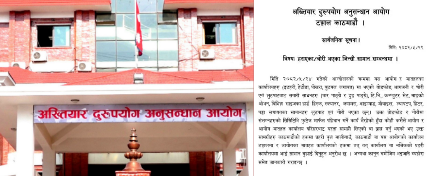 काठमाडौं। अख्तियार दुरूपयोग अनुसन्धान आयोगले विभिन्न कार्यालयबाट लुटपाट भएका सामान फिर्ता गर्न आग्रह गरेको छ ।
