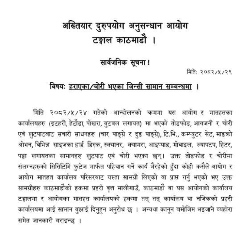आयोगले सूचना निकालेर इटहरी, हेटौंडा, पोखरा, बुटवललगायत कार्यालयमा तोडफोड र आगजनी गरेर लुटपाट भएका उपकरणहरू फिर्ता गर्न आग्रह गरेको हो ।