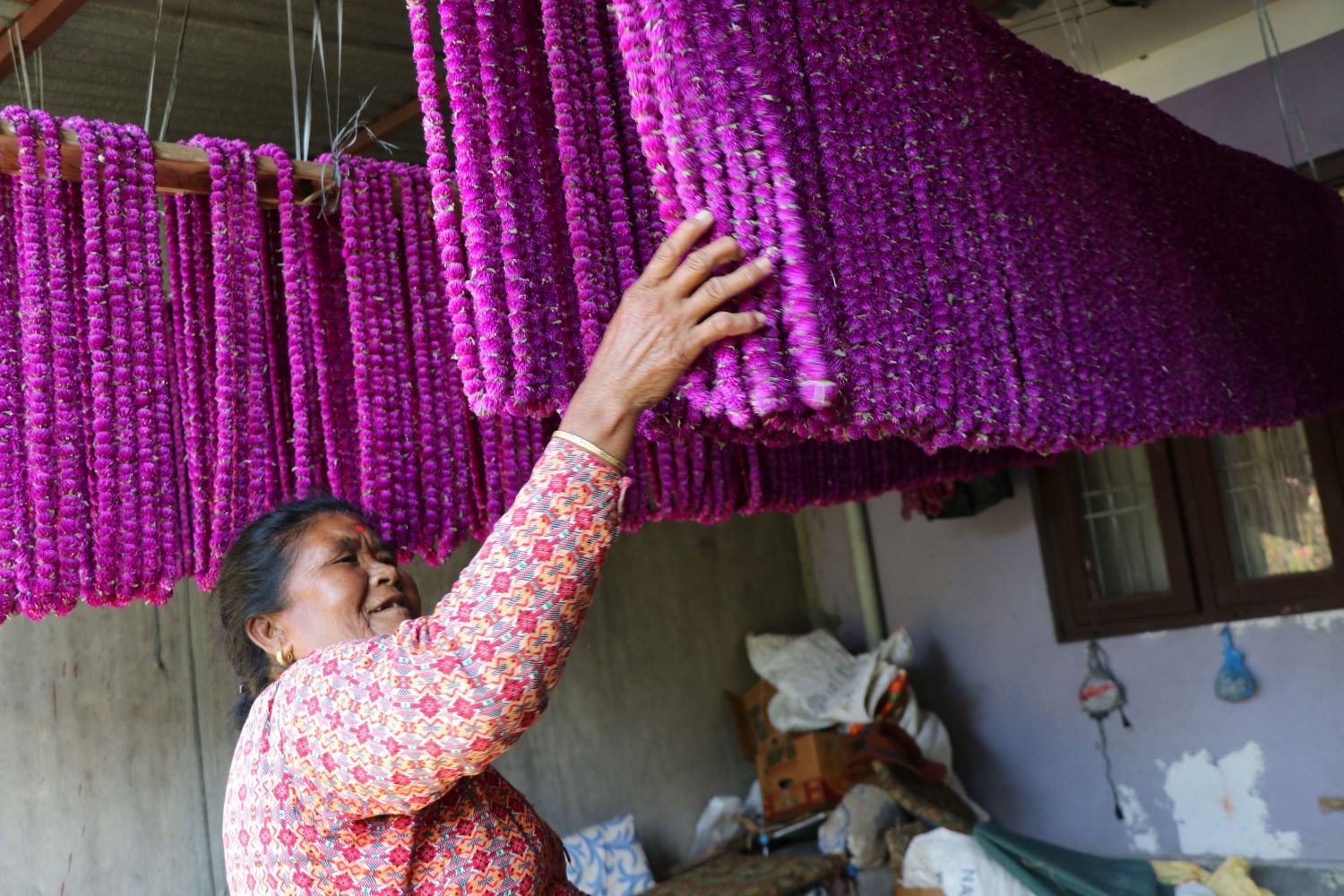 व्यवसायीक फूल खेतीमा रमाएका यहाँका महिलालाई आँगनदेखि बारीभरी लहरै झुलेका मखमली फूल टिपेर माला गाँस्न यतिखेर भ्याइनभ्याई भएको छ । बिहान ६ बजे बारी पुगेका महिलालाई फूल टिपेर डोको, डालो र बोरामा फूल लिएर घर आउने बित्तिकै खाना खाएर फेरी दिनभरि माला गाँस्न र गाउँमै आएका व्यापारीलाई माला बिक्री गर्न भ्याइनभ्याई हुन्छ ।