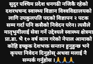 काठमाडौँ । शिक्षा, विज्ञान तथा प्रविधिमन्त्री महावीर पुनले दशरथचन्द स्वास्थ्य विज्ञान विश्वविद्यालयका उपकुलपति पदका लागि दुईपटक विज्ञापन निकाल्दा पनि एकजनाले समेत निवेदन नदिएको भन्दै गम्भीर असन्तुष्टि व्यक्त गरेका छन्। स्वास्थ्य क्षेत्रको उच्च नेतृत्व तहमा योग्य र समर्पित व्यक्तिहरू नआगामी अवस्थाप्रति चिन्ता व्यक्त गर्दै उनले मातृभूमिप्रति प्रतिबद्ध, कम्तीमा १० वर्षसम्म स्वास्थ्य क्षेत्रमा प्राध्यापक ९प्रा।डा।० का रूपमा कार्यअनुभव भएका इच्छुकलाई प्रत्यक्ष रूपमा आफूलाई सम्पर्क गर्न आग्रह गरेका छन्।