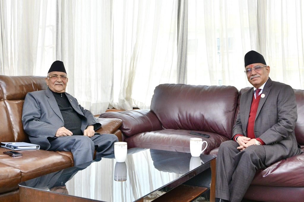 काठमाडौँ । प्रधानमन्त्री पुष्पकमल दाहाल ‘प्रचण्ड’ र नेकपा (एमाले) का अध्यक्ष केपी शर्मा ओलीबीच पछिल्लो राजनीतिक घटनाक्रम र सरकारका गतिविधिबारे छलफल भएको छ ।