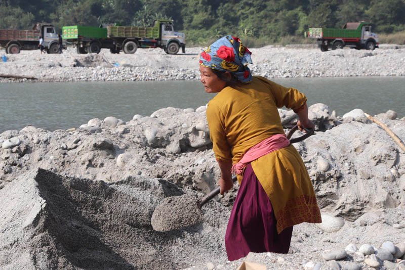 धादिङ : हातमा बेल्चा (साबेल), टाउकामा रुमाल र कम्मरमा सलको पटुकी। एकाबिहानै बालुवा सार्दै गरेकाे अवस्थामा भेटिइन्, कल्पना भुजेल। कठ्याङ्ग्रिँदो जाडोमा पनि खलखल पसिना बगिरहेको छ, तर उनलाई यसको कुनै प्रवाह छैन।