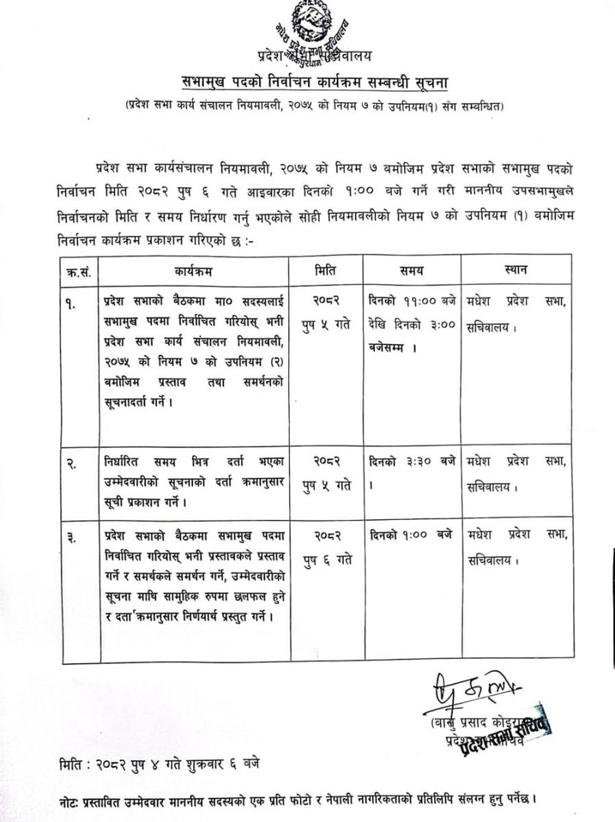 जनकपुरधाम । मधेस प्रदेशसभामा रिक्त सभामुख पदका लागि पुस ६ गते निर्वाचन हुने भएको छ । प्रदेश सभा सचिवालयले शुक्रबार सभामुखको निर्वाचन कार्यतालिका प्रकाशित गरिएको हो ।