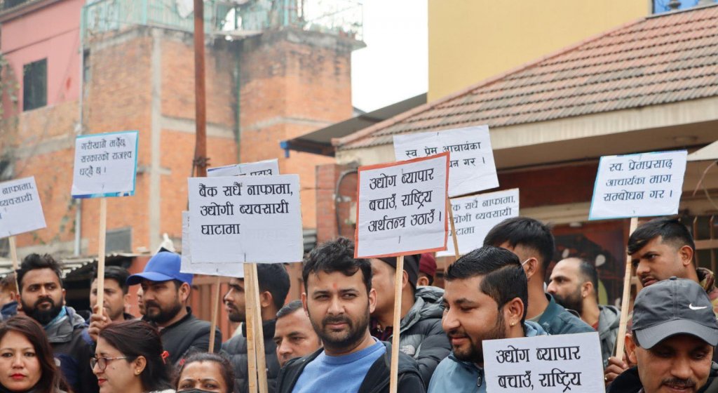 काठमाडौँ । व्यवसायीहरूले बैंकको उच्च ब्याजदरले उद्योग व्यवसायमा पारेको समस्या समाधान गरी लगानीमैत्री वातावरण निर्माण गर्न माग गर्दै प्रदर्शन गरेका छन् ।