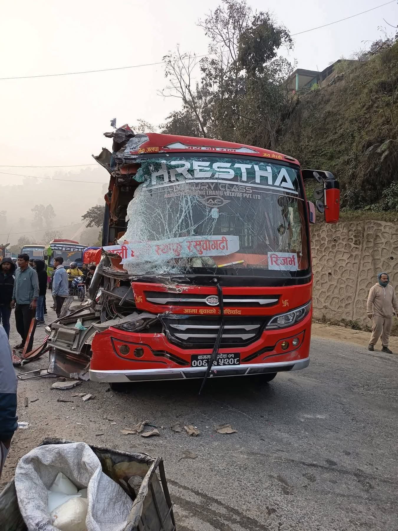 काठमाडौंबाट नुवाकोट हुँदै रसुवा जाँदै गरेको बस र दाङबाट काठमाडौं जाँदै गरेको रात्रीबस आपसमा ठोक्किँदा सडक छेउमा चिया खाइरहेका एक व्यक्तिको घटनास्थलमै मृत्यु भएको हो। मृतक सडक छेउमा रोकिराखिएको टिपरका चालक रहेको प्रहरीले जनाएको छ।