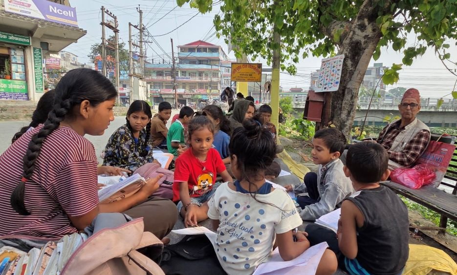 धरान (सुनसरी), १९ चैतः पिपलको छहारीमुनि विछच्याइएका छन् प्लास्टिकका म्याट र बोरा । पिपलको रुखमा अड्याइएको बोर्डमा लेखिएको छ,‘श्री पिपलबोटे खुल्ला विद्यालय’ । जहाँ नर्सरीदेखि कक्षा ७ सम्म पढ्ने ३०÷३५ जना बालबालिका दिनहुँ बिहान ७ बजे किताब, कापी र कलम च्यापेर ट्युसन (अध्यापन कक्षा) पढ्न आइपुग्छन् । चन्द्र सर अर्थात चन्द्र भण्डारीले ती बालबालिकालाई लेखपढमा सहायता गर्नुहुन्छ । विद्यालयमा पढ्दा नबुझेका पाठहरु बुझाउनुहुन्छ । गृहकार्य गर्न सहजीकरण गर्नुहुन्छ । यो दृश्य हो, इटहरीको व्यस्त सडक पूर्व–पश्चिम राजमार्ग पर्ने इटहरीस्थित टेङ्ग्रा खोलाको किनार छेवैको गल्ली ।