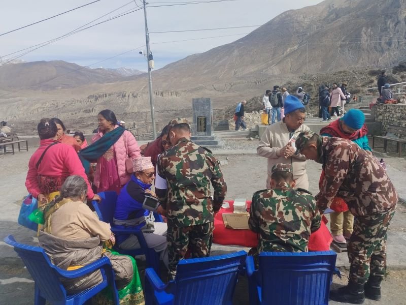 मुस्ताङ, २० चैतः मुक्तिनाथधामस्थित दर्शनार्थी विश्रामस्थल प्राङ्गणमा सञ्चालन गरिएको एकदिने निःशुल्क स्वास्थ्य शिविरमा १६८ जना दर्शनार्थी पर्यटक लाभान्वित भएका छन् । नेपाली सेनाको जोमसोमस्थित इन्द्रबक्स गणको आयोजनामा बिहीबार सञ्चालन गरिएको स्वास्थ्य शिविरमा मुक्तिनाथ दर्शन गर्ने दर्शनार्थी पर्यटकको निःशुल्क स्वास्थ्य परीक्षण गरिएको हो ।