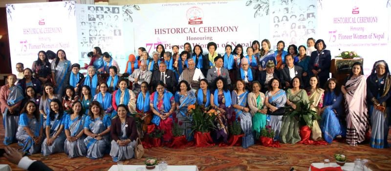 नेपाल चेम्बर अफ कमर्सको हीरक जयन्तीका अवसरमा नेपाल महिला चेम्बरद्वारा आयोजित विशेष कार्यक्रममा प्रथम राष्ट्रपति रामवरण यादव, नेपाल महिला चेम्बरका अध्यक्ष उर्मिला श्रेष्ठ, नेपाल चेम्बर अफ कमर्स हीरक जयन्ती समारोह समितिका अध्यक्ष राजेशकाजी श्रेष्ठ र नेपाल चेम्बर अफ कमर्सका अध्यक्ष कमलेशकुमार अग्रवालले संयुक्त रुपमा विभिन्न क्षेत्रहरूमा ऐतिहासिक योगदान पु¥याएका महिलाहरूलाई विशेष सम्मान गर्नुभएको हो ।