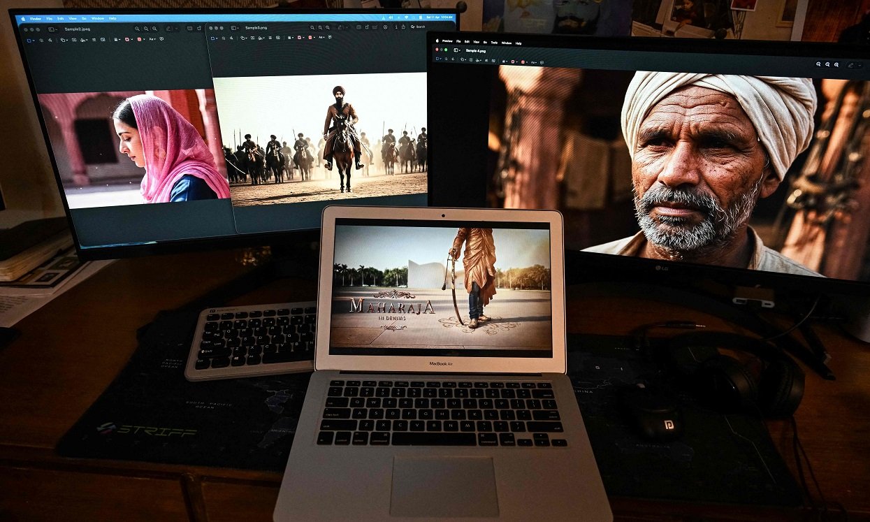 This photograph taken on April 11, 2026 shows visuals from Maharaja in Denims, a book adaptation being developed as the world’s first full-length AI-generated realism film, displayed on computers at the residence of Khushwant Singh, the book's author and co-founder of artificial intelligence-driven production house Intelliflicks Studios in Chandigarh. Many filmmakers fear the existential threat of artificial intelligence, but in India the race is on to produce the first hit Bollywood feature generated by the technology. One contender is "Maharaja in Denims", based on a popular 2014 novel by Khushwant Singh and set for cinematic release this summer. (Photo by Tauseef MUSTAFA / AFP) / To go with 'India-Entertainment-Bollywood-AI' FOCUS by Seema SINHA