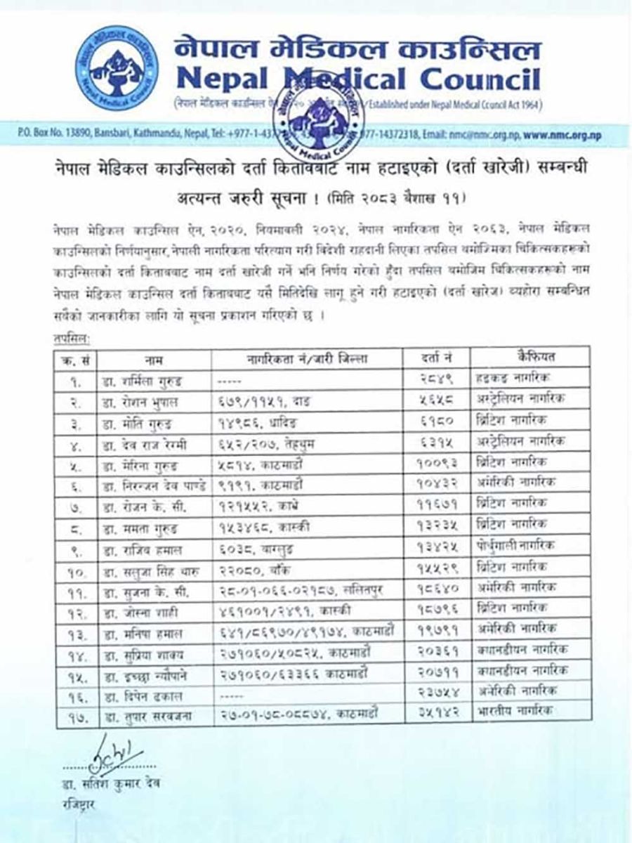 शुक्रबार काउन्सिलले सूचना जारी गर्दै उनीहरूको नाम दर्ता किताबबाट हटाइएको जनाएको हो । नेपाल मेडिकल काउन्सिल ऐन २०२०, नियमावली २४, नेपाल नागरिकता ऐन २०६३ तथा काउन्सिलको निर्णयअनुसार उक्त कदम चालिएको जनाइएको छ ।