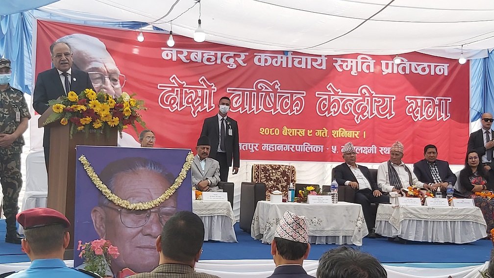 जसले हिजो लोकतन्त्रका निम्ति, राष्ट्रिय स्वाधिनताका निम्ति लामो भूमिका खेले तिनलाई नै पछि पार्ने गरी विस्थापित गर्ने गरी अराजकता पैदा गर्दैछ । यसमा वौद्धिक वर्गले ध्यान दिनु जरुरी छ ।” अप्रिल २२ कम्युनिष्ट आन्दोलनको परिचर्चा गर्ने दिन भएको बताउनुहुँदै प्रधानमन्त्री दाहालले विगतका कमी–कमजोरीको समीक्षा गरेर नेपालको कम्युनिष्ट आन्दोलनलाई सही नीति, विधिअनुरुप छिट्टै ध्रुवीकरण गर्ने दिशामा लाग्नुपर्ने बताउनुभयो । उहाँले कम्युनिष्ट आन्दोलन अझै पनि जनतामा लोकप्रिय भएको बताउँदै सिद्धान्तनिष्ठ एकता आवश्यक भएको उल्लेख गर्नुभयो । प्रधानमन्त्री दाहालले नरबहादुर कर्माचार्य सम्मानित व्यक्तित्वमात्रै नभएर क्रान्तिकारी भएर बस्नुभएको स्मरण गर्नुभयो । उहाँले कर्माचार्य मुस्किल कुरालाई सहज बनाउने पारदर्शी व्यक्तित्व भएको र मजदुर आन्दोलनको प्रत्यक्ष भूमिका निर्वाह गरेको बताउनुभयो ।