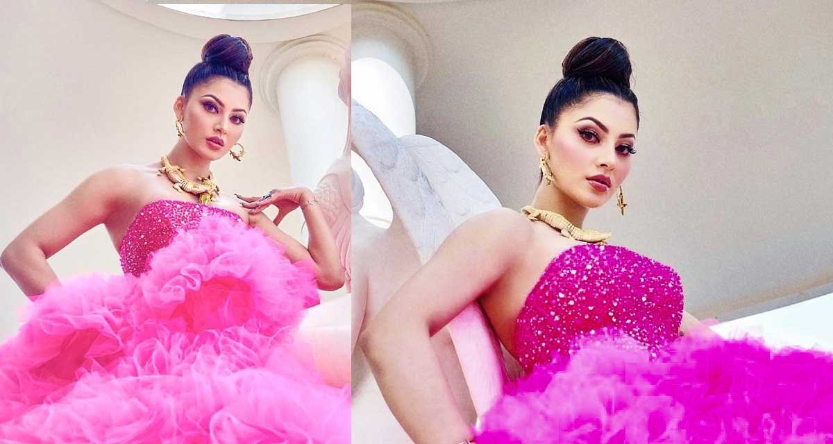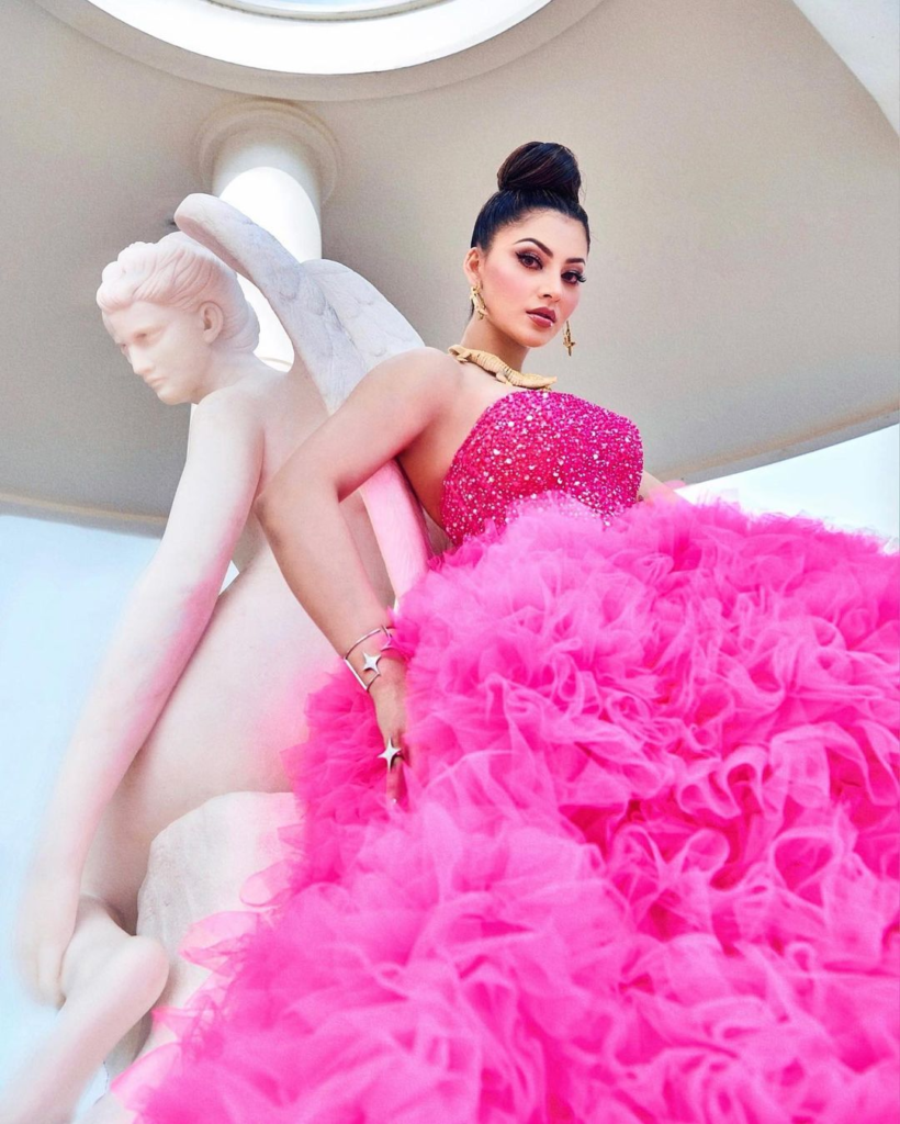 अभिनेत्री उर्वशीले गुलाबी अफ शोल्डर टुल गाउनमा देखिएकी थिइन्। यस सुन्दर पोशाकको मल्टी लेयर्ड फ्लोरल रफेल पैटर्नले यसमा थप आकर्षण थपेको छ।