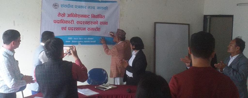 संसदीय पत्रकार मञ्च गण्डकी निर्वाचन समिति संयोजक एवं कानून व्यवसायी सरास्वती सुवेदीले निर्वाचित पदाधिकारी तथा सदस्यहरुलाई सपथ तथा पदस्थापन गराउनुभएको थियो । संसदीय पत्रकार मञ्च गण्डकीका अध्यक्ष भरत कोइराला, नागरिक समाजका कास्कीका अध्यक्ष नरेन्द्रमान लालचन, नेपाल पत्रकार महासंघ कास्कीका सचिव माधव बराल लगायतले आफ्ना भनाई राख्नुभएको थियो ।