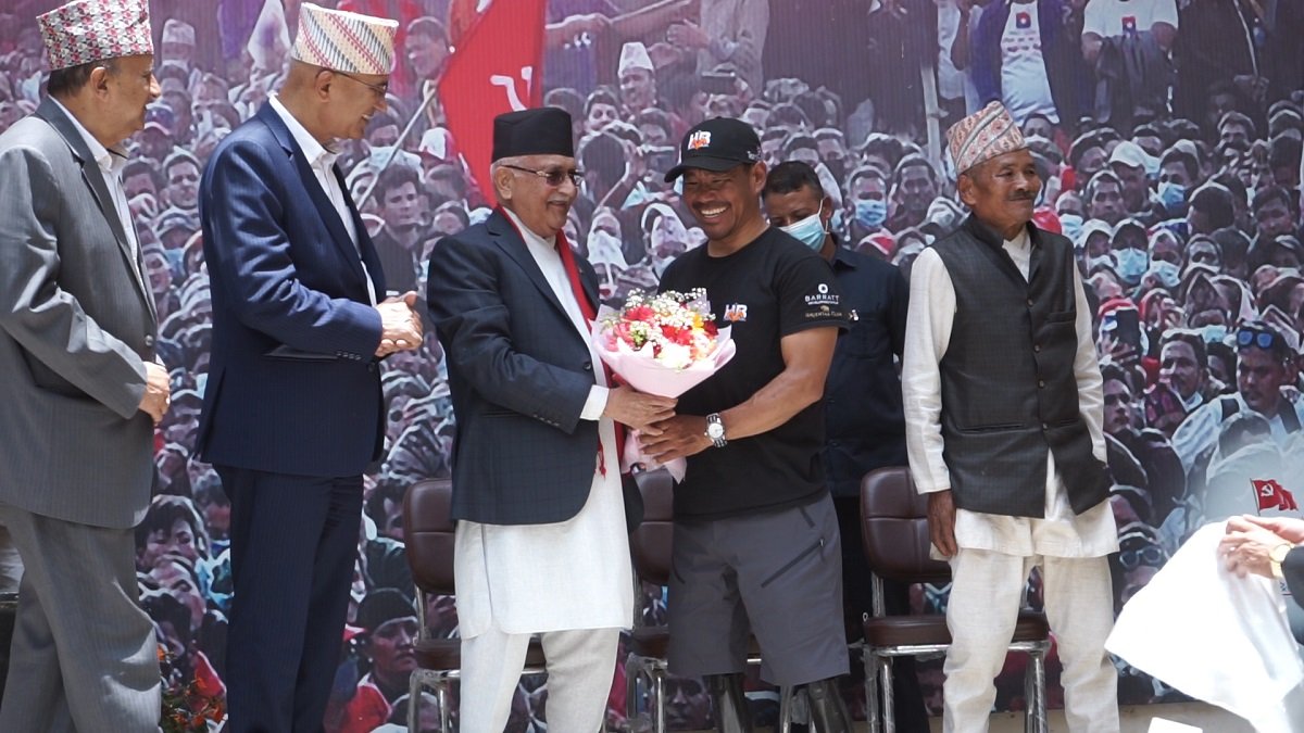 एमाले अध्यक्ष एवं पूर्वप्रधानमन्त्री केपी शर्मा ओलीले आइतबार ललितपुरको च्यासलस्थित पार्टीको केन्द्रीय कार्यालयमा एक कार्यक्रमको आयोजना गरी सगरमाथाको सफल आरोहण गरी विश्व कीर्तिमान राख्न सफल उनलाई पुष्पगुच्छासहित सम्मान गरेका हुन्।