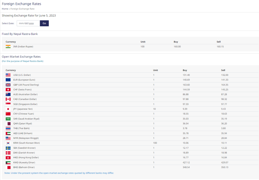त्यस्तै, आज डलरको खरिद दर १३१ रुपैयाँ ४० पैसा र बिक्री दर १३२ रुपैयाँ ०० पैसा रहेको छ। युरो एकको खरिद दर १४० रुपैयाँ ६९ पैसा र बिक्री दर १४२ रुपैयाँ ३३ पैसा रहेको छ।