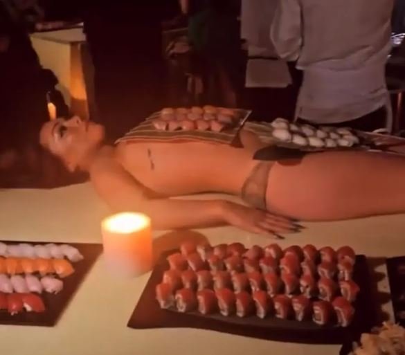 कान्येको जन्मदिनको पार्टीका विभिन्न भिडियोहरू इन्टरनेटमा भाइरल भएका छन्। ती भिडियोहरूमा एक महिला बिकिनी र हिल लगाएर टेबुलमा सुतिरहेको देखिन्छ। उनको शरीरका विभिन्न भागमा सुशीको प्लेट राखिएको छ । पार्टीका पाहुनाहरू ती प्लेटबाट सुसी खाँदै गरेको देखिन्छ।