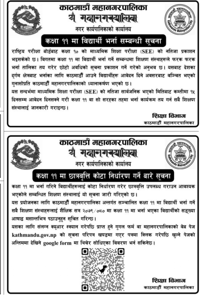 कक्षा ११ मा भर्ना गरिने विद्यार्थीहरूलाई कोटा निर्धारण गरेर छात्रवृत्ति उपलब्ध गराउन आवश्यक भएकोले सम्बन्धित शिक्षण संस्थालाई निर्देशन दिइएको काठमाडौं महानगरले सूचना प्रकाशित गरेर भनेको छ।