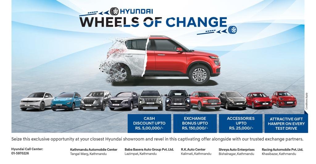काठमाडौँ । नेपालमा हुन्डाई गाडीहरूको आधिकारिक वितरक, लक्ष्मी इन्टरकन्टिनेन्टल प्रा. लि. ले ‘ह्वील्स अफ चेन्ज’ नामक एक्सचेञ्ज अफर योजना ल्याएको छ । साउन १८ बाट सुरु हुने यो योजना हुण्डाई नेपाल अन्तर्गतको हुन्डाई प्रमिसको सहकार्यमा ५ प्रतिष्ठित कार एक्सचेञ्ज विक्रेताहरूसँगको साझेदारीमा ल्याइएको हो ।