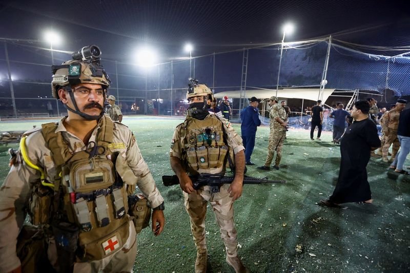 Iraqi security forces inspect the site where an explosive device attached to a vehicle detonated, leading to another explosion of a gas tanker that was close by, in Baghdad, Iraq, October 29, 2022. REUTERS/Thaier Al-Sudani