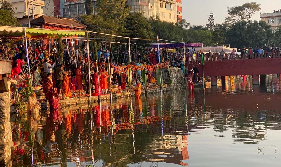 अस्ताउँदो सूर्यको पूजा आराधना गर्न कमलपोखरीलाई झकिझकाउ पारिएको थियो । कमलपोखरीमा श्रद्धालु, बर्तालु र भक्तजनको बाक्लो उपस्थिति थियो ।