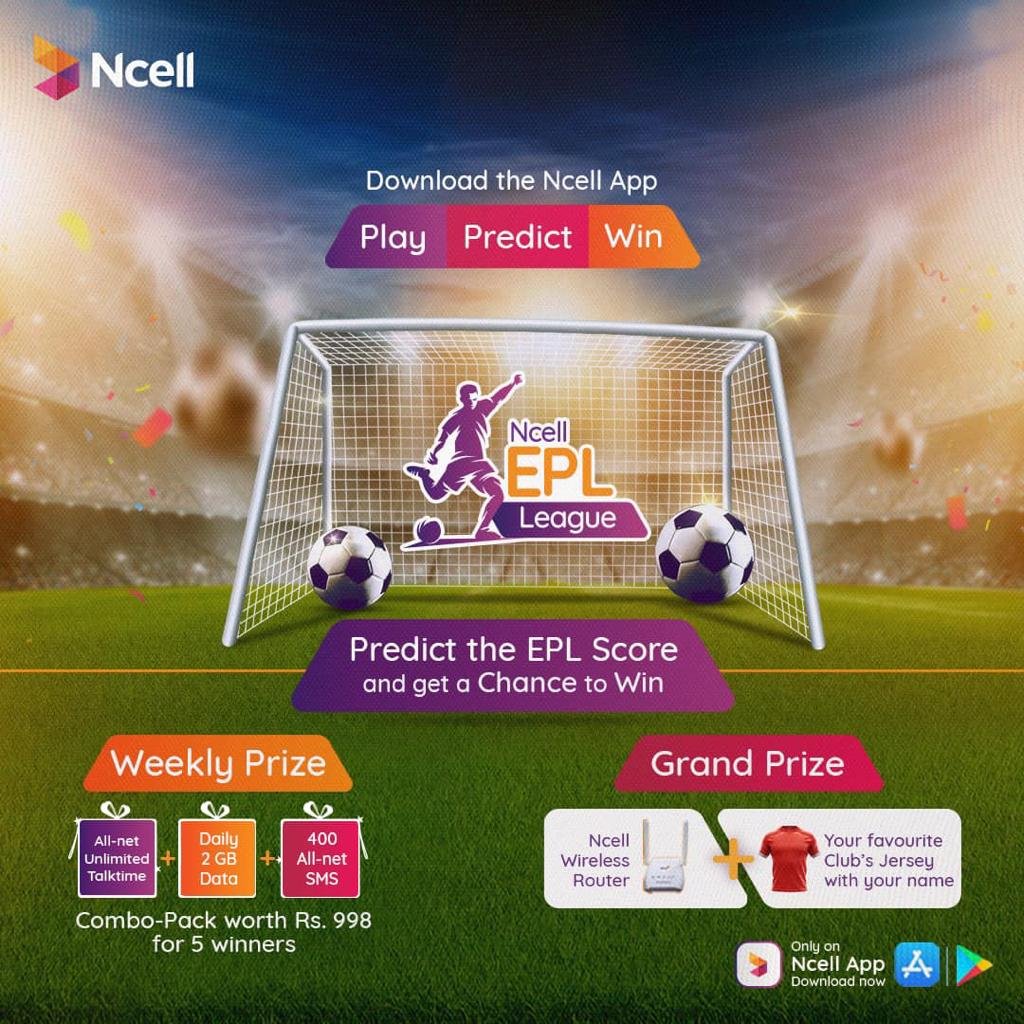 एनसेल आजियाटा लिमिटेडले हाल संचालनमा रहेको इङ्लिस प्रिमियर लिग (ईपीएल) २०२३÷२४ को अवसरमा एनसेल एपमा ‘एनसेल ईपीएललिग’प्रतियोगिता सुरु गरेको छ । यस प्रतियोगिता अन्तर्गत सहभागी ग्राहकहरुले साप्ताहिक रुपमा र ईपीएल सिजनको अन्त्यमा तीन जनाले ग्रान्ड प्राइज अर्थात मुख्य पुरस्कार जित्ने मौका पाउँछन् ।