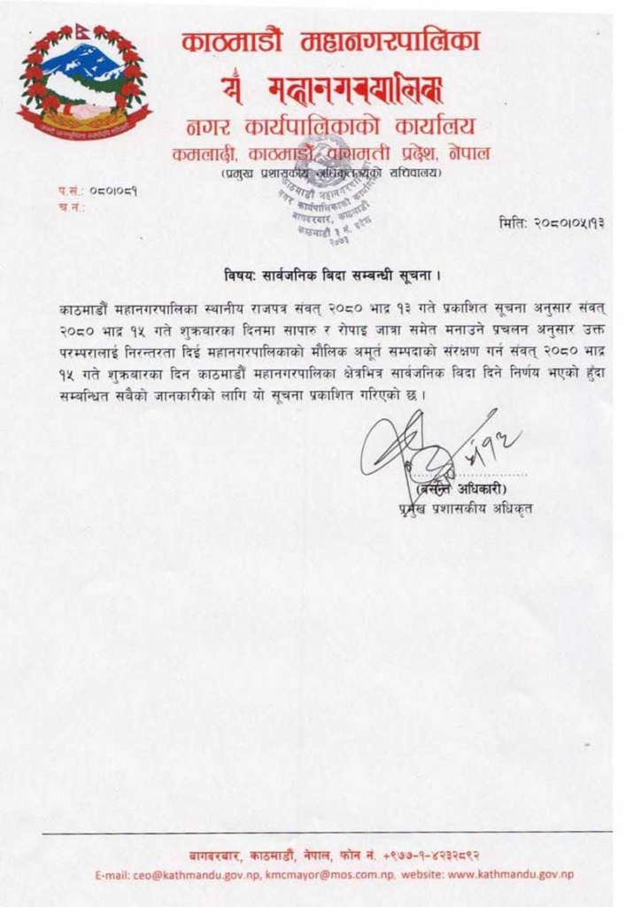 काठमाडौँ महानगरले दियो शुक्रबार सार्बजनिक बिदा