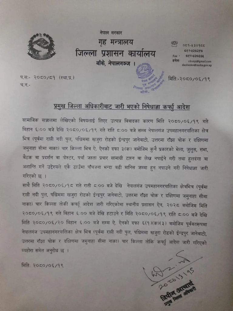जिल्ला प्रशासन कार्यालय बाँकेले एक सूचना जारी गर्दै फेरि कर्फ्यु लगाइएको जानकारी दिएको हो । प्रमुख जिल्ला अधिकारी विपिन आचार्यद्वारा जारी गरिएको आदेशमा सामाजिक सञ्जालमा लेखिएको विषयलाई लिएर उत्पन्न विवादका कारण शुक्रबार बिहान ६ बजेदेखि राति ८ बजेसम्म नेपालगन्ज उपमहानगरपालिका क्षेत्रभित्र निषेधाज्ञा जारी गरिएको उल्लेख ।