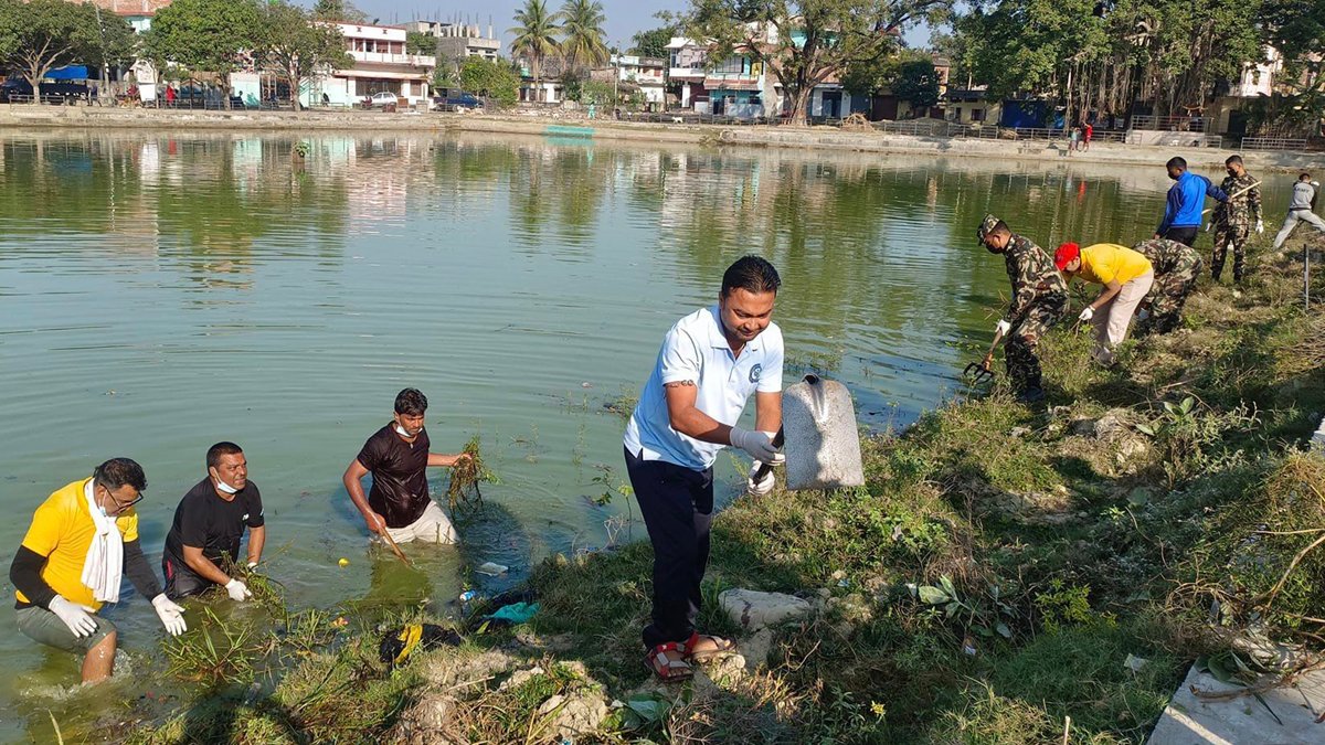 जविराज नगरपालिका-३ नं. वडा कार्यालयको अगुवाइमा आउँदै गरेको छठ पर्वलाई लक्षित गरी कल्टुदास पोखरीको मंगलबार सरसफाइ गरिँदै। यहाँ प्रत्येक वर्ष छठ पर्व मनाइन्छ। तस्बिर स् अरूणकुमार यादवररासस