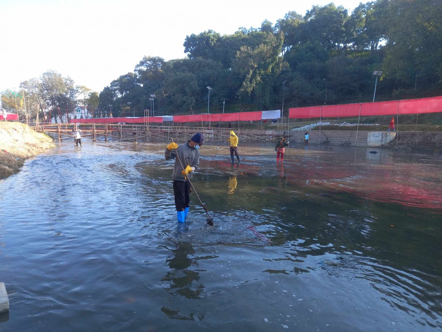 नदीको बीचमा छठी माताको माटाको मूर्ति स्थापना गर्न लागिएको छ । माटाको मूर्तिमा आइतबार र सोमबार पूजा आराधना गरी सोमबार बिहान उदाउँदो सूर्यलाई अघ्र्य दिएसँगै बागमती नदीमै सेलाइने समितिका सचिव राजकुमार पोदारले बताए ।