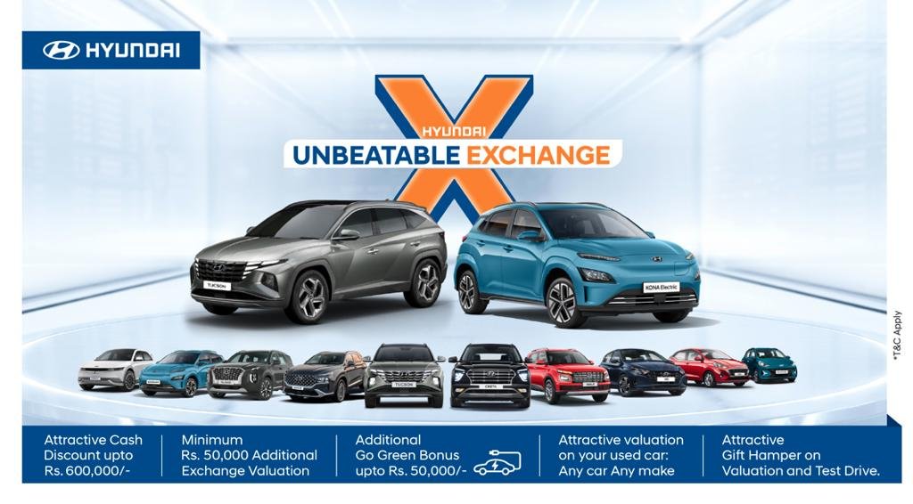 यस एक्सचेन्जमा ग्राहकहरूलेआफ्नो गाडीको बजारको प्रचलित मूल्याङ्कन भन्दा न्युनतम रु. ५०, ००० थप पाउनुका साथै विद्युतीय गाडीको खरिदगर्दा प्रोत्साहन स्वरुपरु। ५०, ००० सम्मको गो ग्रीन बोनसपनिप्राप्त गर्न सक्ने छन््रबिभिन्न मोडलहरुको खरिदमा नगद रु. ६००, ००० सम्मकोआकर्षक छुटकासाथैहुन्डाई शोरुममा गएरआफ्नो गाडीको मूल्याङ्कन गराइर हुन्डाई गाडीको टेस्ट ड्राइभ गरी आकर्षक उपहारहरु पनि जित्न सकिने कम्पनीद्वारा जारी विज्ञप्तिमा उल्लेख छ। शोरुममा तुरुन्तै पुरानो गाडीको मूल्यांकन गरी छिटोछरितो माध्यमद्वारा यो एक्सचेन्ज योजना सफल बनाउन हुन्डाई प्रतिबद्ध छ।