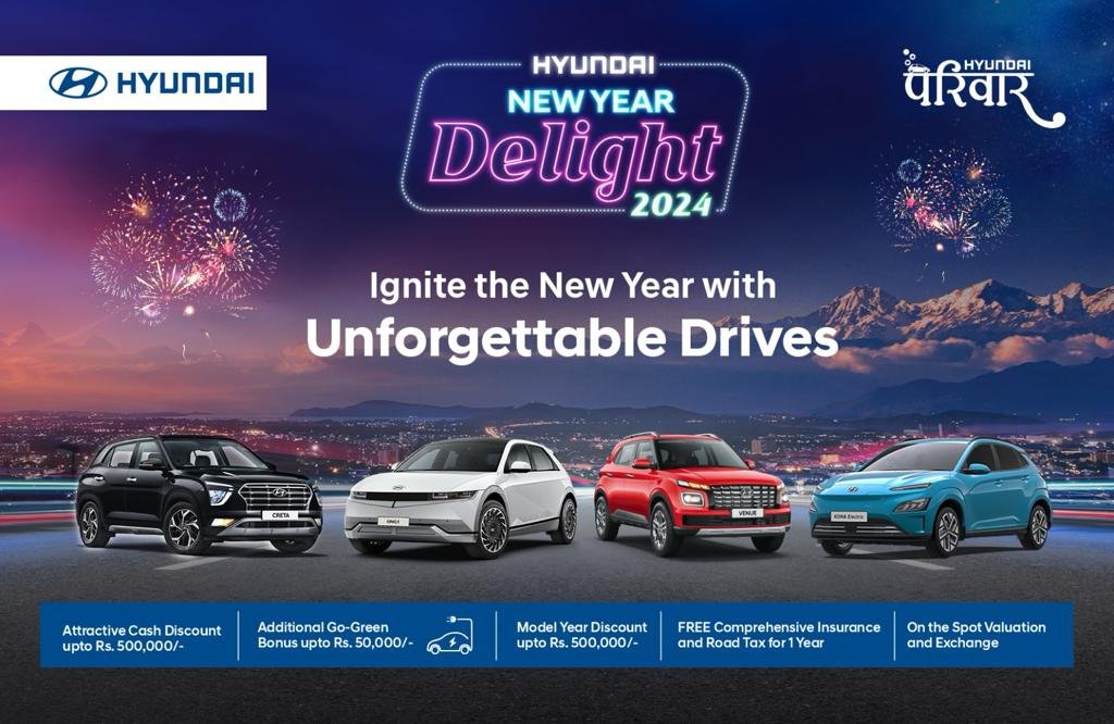काठमाडौं । हुन्डाइ अटोमोबाइल्सको आधिकारीक बिक्रेता लक्ष्मी इन्टरकन्टिनेन्टलले अंग्रेजी नयाँ वर्षलाई मध्यनजर गर्दै हुन्डाइ न्यू इयर डिलाइट-२०२४ योजना सार्वजनिक गरेको छ ।