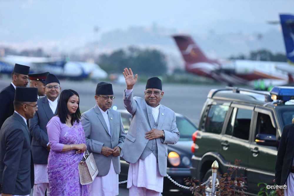 प्रधानमन्त्री नेतृत्वको प्रतिनिधिमण्डलमा उनकी सुपुत्री गङ्गा दाहाल, परराष्ट्रमन्त्री एनपी साउद, परराष्ट्रसचिव सेवा लम्साल तथा नेपाल सरकारका वरिष्ठ अधिकारी रहने परराष्ट्र मन्त्रालयले जनाएको छ ।