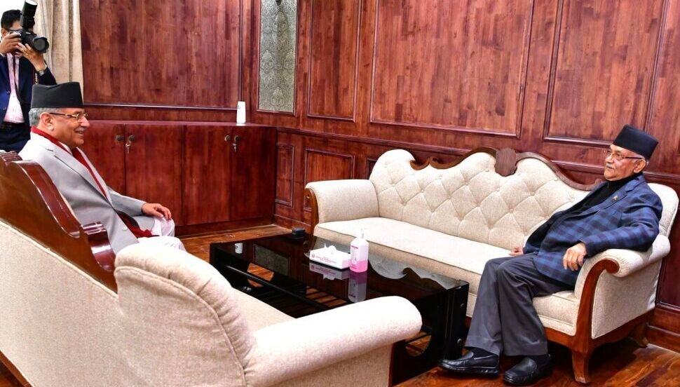 काठमाडौं। प्रधानमन्त्री पुष्पकमल दाहाल ‘प्रचण्ड’ र नेकपा (एमाले) का अध्यक्ष एवं पूर्व प्रधानमन्त्री केपी शर्मा ओलीबीच भेटवार्ता भएको छ । आज (बिहीबार) विहान प्रधानमन्त्री तथा मन्त्रिपरिषद्को कार्यालय सिंहदरबारमा उनीहरुबीच भेटवार्ता भएको हो ।