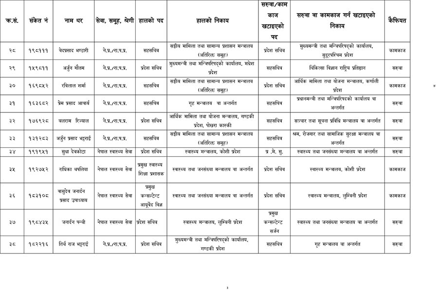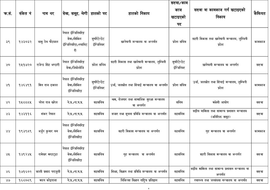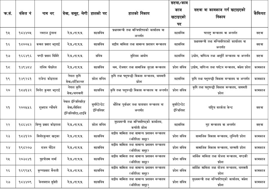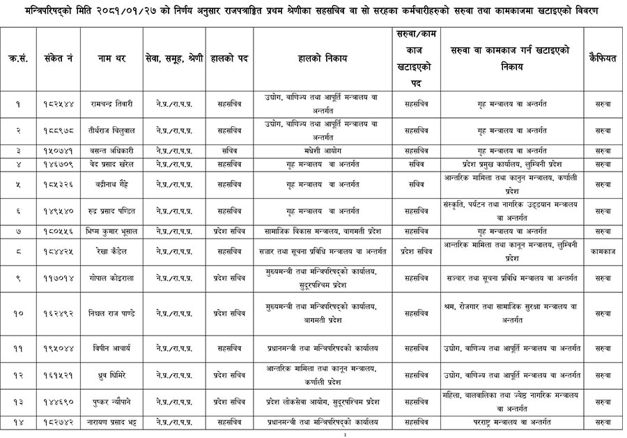 यस्तै, मन्त्रिपरिषद कार्यालयका सहसचिव नारायणप्रसाद भट्ट र नवराज ढुंगानालाई परराष्ट्र मन्त्रालयमा सरुवा गरिएको छ भने बाग्मतीको सामाजिक विकास मन्त्रालयका ससचिव रहेका भीष्मकुमानर भुसाललाई गृह मन्त्रालयमा सरुवा गरिएको छ ।