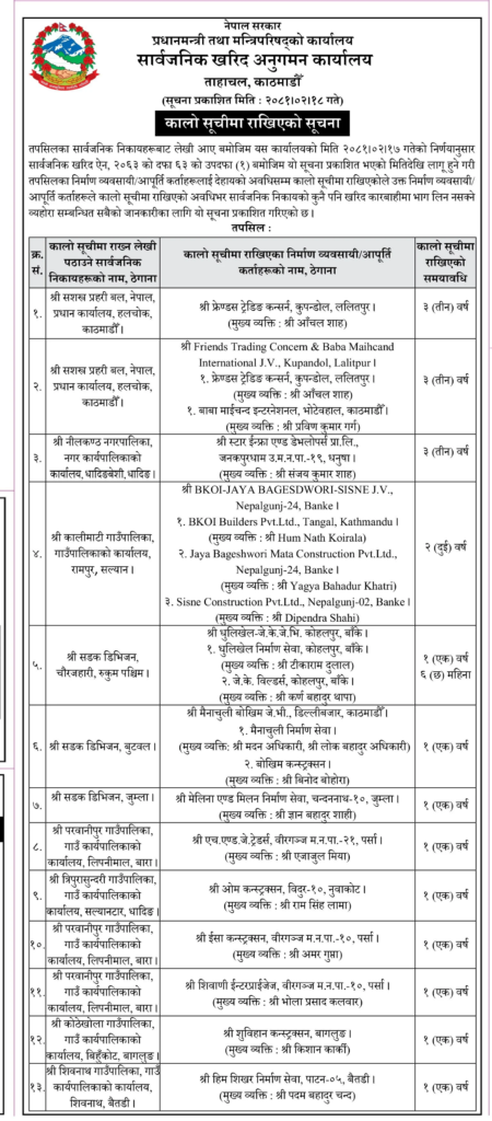 जेठ १७ गतेको निर्णयअनुसार सार्वजनिक खरिद ऐन, २०६३ को दफा ६३ को उपदफा (१) बमोजिम आजबाट लागू हुने गरे, १ देखि ३ वर्षसम्मका लागि निर्माण कम्पनीहरूलाई कालो सूचीमा राखिएको हो ।