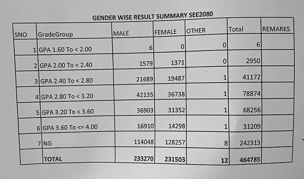 ननग्रेड ल्याउनेको संख्या २ लाख ४२ हजार ३१३ अर्थात ५२.१४ प्रतिशत परीक्षार्थीले ननग्रेड (एनजी) ल्याएका छन् ।