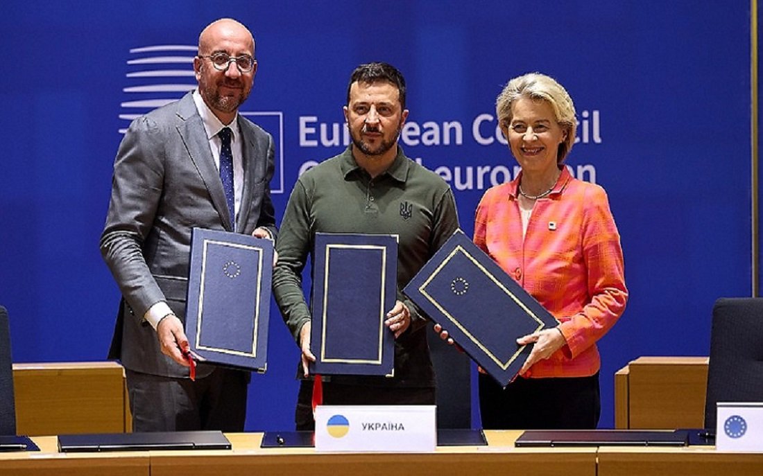 काठमाडौं । युरोपेली संघ (ईयु) र युक्रेनले सुरक्षा सम्झौता हस्ताक्षर गरेका छन् । ब्रसेल्समा भएको युरोपेली परिषद् शिखर सम्मेलनमा युक्रेनी राष्ट्रपति भोलोदिमिर जेलेन्स्कीले युरोपेली परिषद्का अध्यक्ष चार्ल्स मिसेल र युरोपेली आयोगका अध्यक्ष उर्सुला भोन डेर लेयेनसँगै सुरक्षा सम्झौतामा हस्ताक्षर गरेका हुन् ।