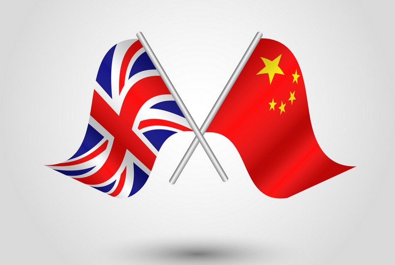 vector two crossed british and chinese flags on silver sticks - symbol of united kingdom and china