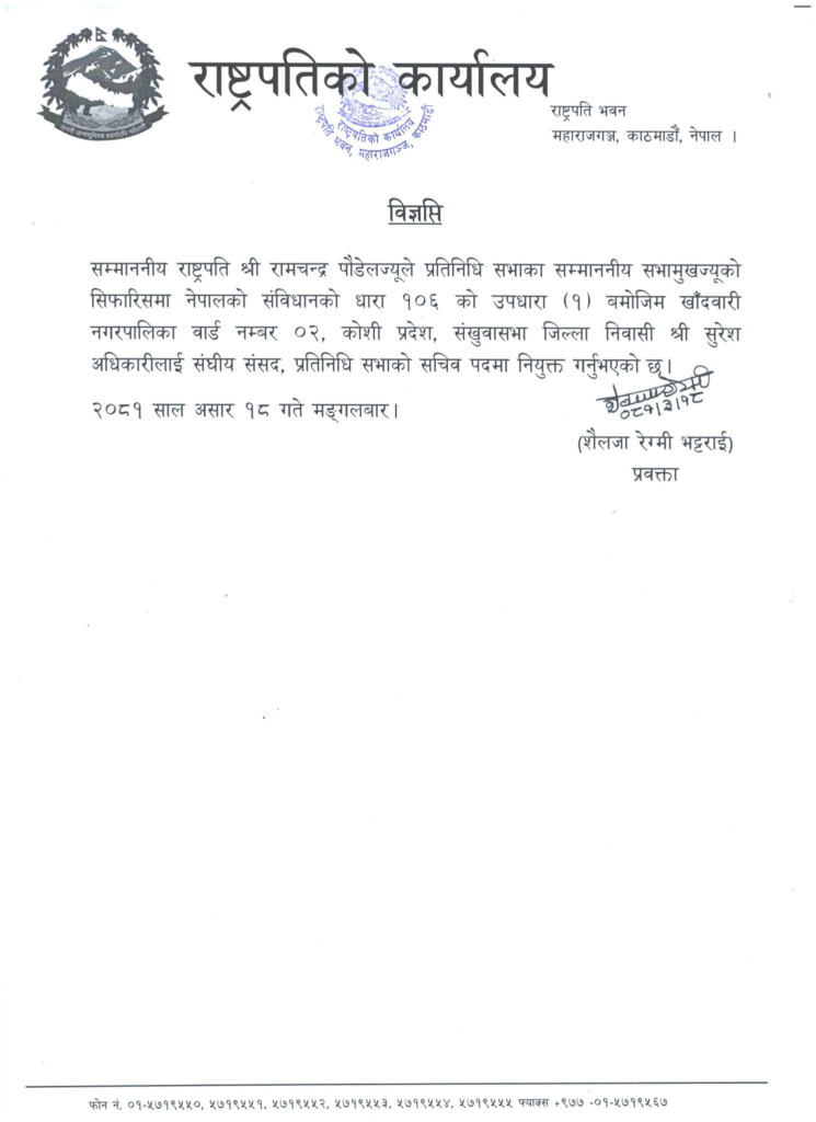 काठमाडौं । प्रतिनिधि सभाको सचिवमा सुरेश अधिकारी नियुक्त भएका छन् ।उनलाई मंगलबार राष्ट्रपति रामचन्द्र पौडेलले सचिवमा नियुक्त गरेका हुन् ।