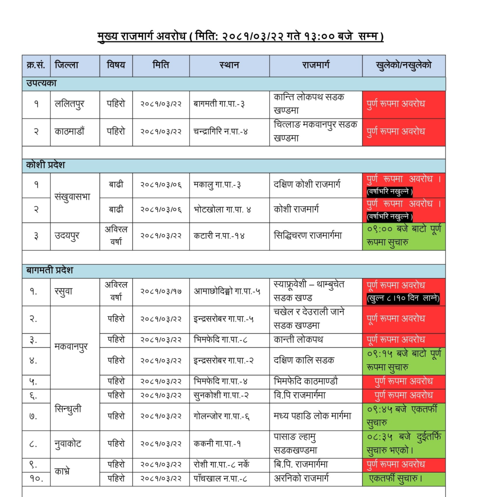 रसुवाको स्याफ्रुबेसी–थाम्बुचेत सडक, चखेल–देउराली जाने सडक, सिन्धुलीको सुनकोसी गाउँपालिका २ मा गएको पहिरोका कारण बिपी राजमार्ग र काभ्रेको रोशी गाउँपालिका ८ नर्केमा भएको अवरोधका कारण बिपी राजमार्ग पूर्ण रूपमा बन्द भएको छ । मनाङको चामेमा बाढीका कारण चामे–वेँसीसहर सडकखण्ड पूर्णरूपमा अवरोध भएको प्रहरीले जनाएको छ । म्यादीमा पहिरोका कारण बेनी–दरवाङ सडक र बेनी जोमसोम सडक पूर्णरुपमा अवरुद्ध भएको छ । लमजुङमा पहिरोका कारण बेशीसहर मनाङ सडक पूर्णरूपमा अवरुद्ध भएको छ भने तनहुँको आँबुखैरेनीमा पहिरोका कारण पृथ्वी राजमार्गमा अवरुद्ध भएको छ ।