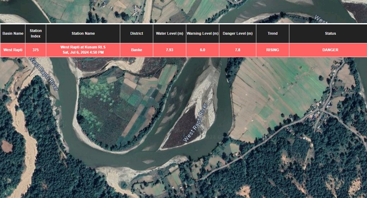 विभागको कुसुमस्थित जलमापन केन्द्रमा सतर्कता तह ६ हो । तर, सो स्थानमा राप्ती नदीको जल सतह यतिखेर खतराको तह पार गरेर निरन्तर बढ्दो छ ।