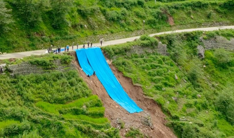 पहिरो नरोकिएपछि जिल्ला प्रशासन कार्यालयले सोमबार सुरक्षाकर्मी लगाएर पहिरो गएको ठाउँमा त्रिपाल बिछ्याएको हो।