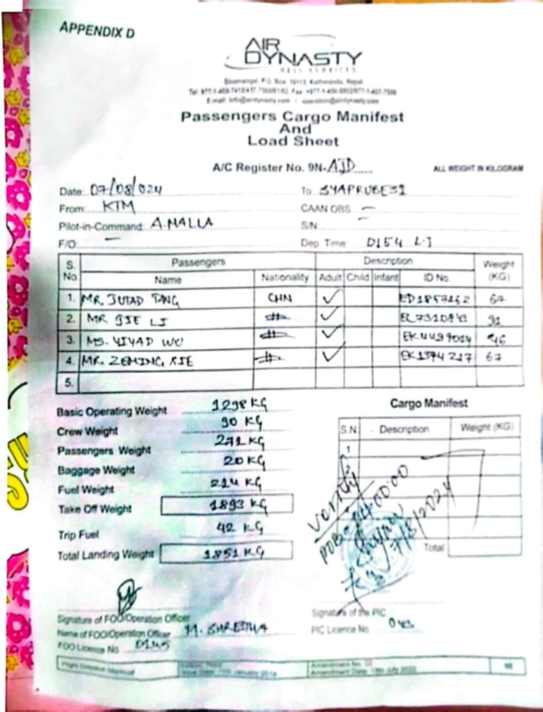 हेलिकप्टरमा पाइलट अरुण मल्लसहित चार चिनियाँ नागरिक सवार रहेको एयर डाइनेस्टीका व्यवस्थापक बालकृष्ण पण्डितले जानकारी दिए ।