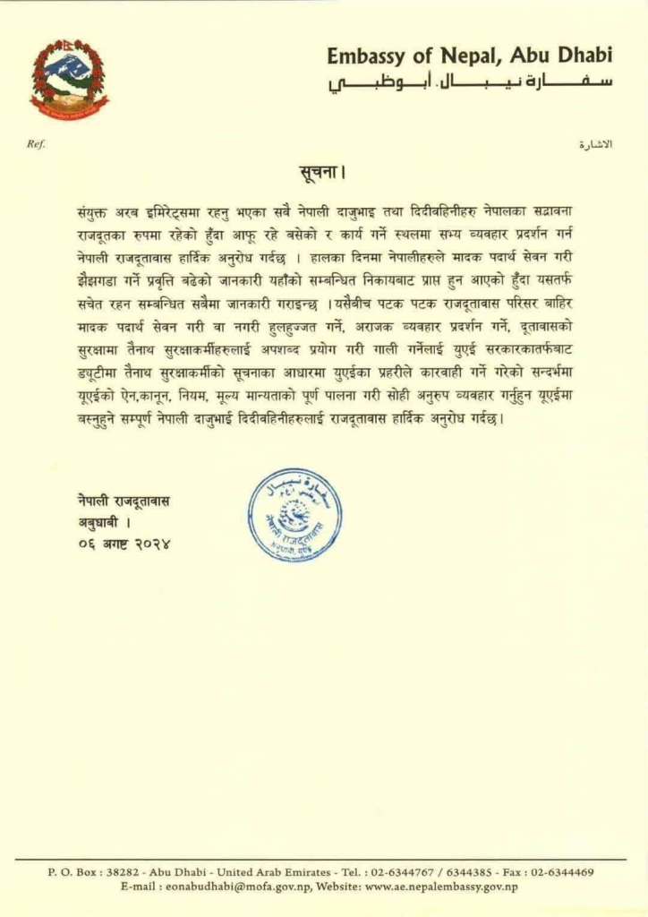 यूएईको सरकारी निकायले नेपालीहरूले मदिरा सेवन गरेर झगडा गरेको विषयमा दूतावासमा जानकारी गराएको सूचनामा उल्लेख छ।